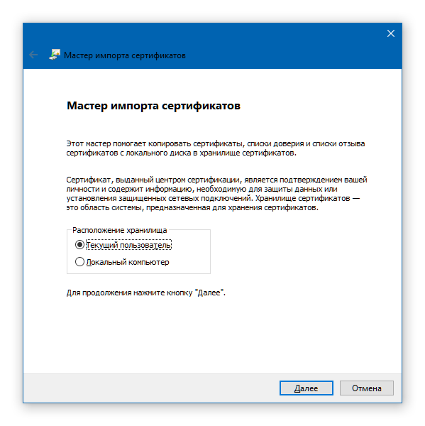 Его необходимо открыть (запустить) двойным или одинарным нажатием мышки, в зависимости от Ваших настроек - Откроется главное окно "Мастер импорта сертификатов":