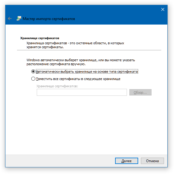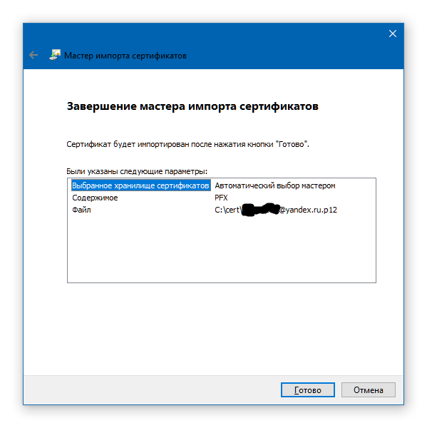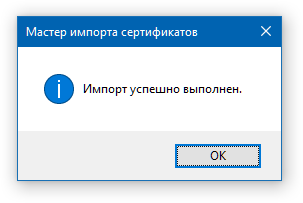 Оставить выбранным пункт "Автоматический выбор..." и нажать "Далее" - Откроется окно "Завершение мастера импорта сертификатов":