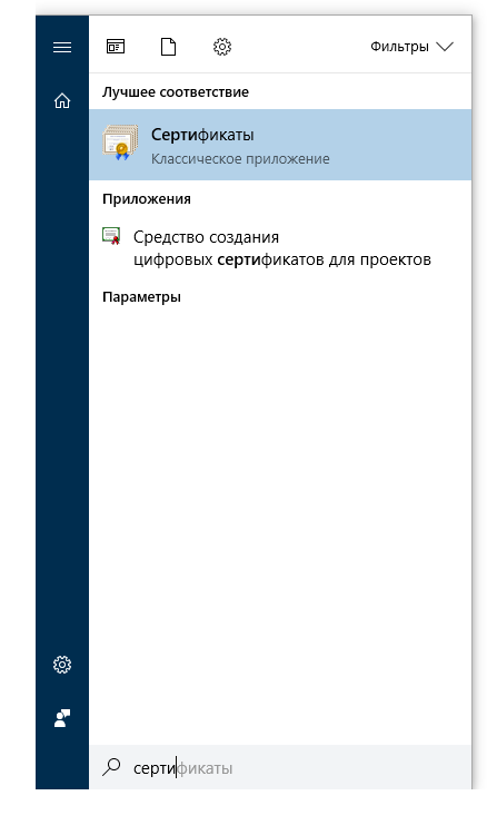 Далее сразу начать писать на клавиатуре слово "Сертификаты", в верхней части меню "Пуск" отобразиться пункт "Сертификаты", который необходимо выбрать мышкой или нажатием клавиши "Enter" - Откроется окно "Сертификаты":