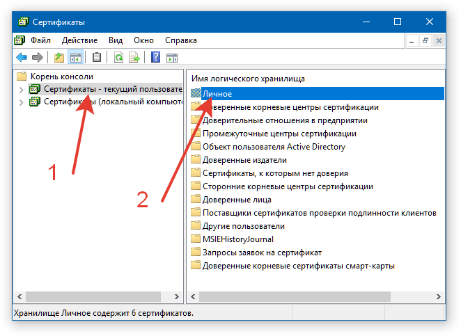В левой части окна необходимо выбрать пункт "Сертификаты - текущий пользователь" (1), затем в правой части окна выбрать папку "Личное" (2) двойным нажатием...