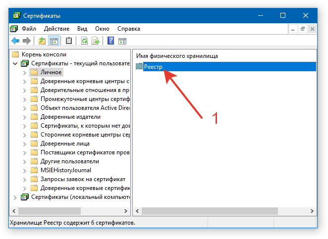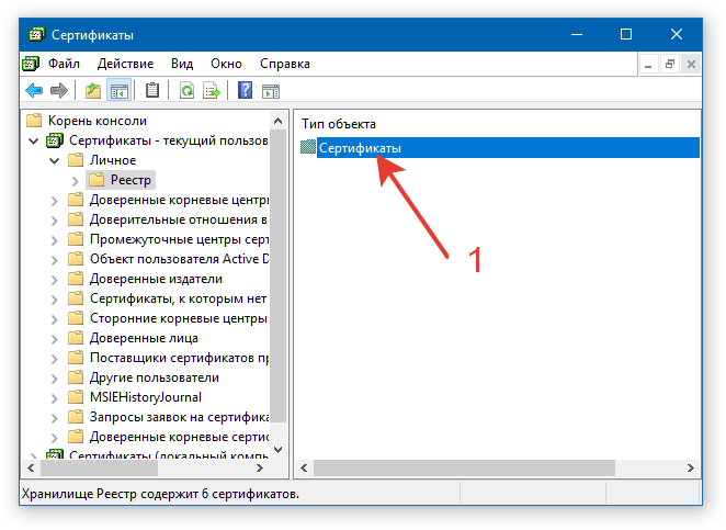 В правой части окна выбрать папку "Сертификаты" (1) двойным нажатием...