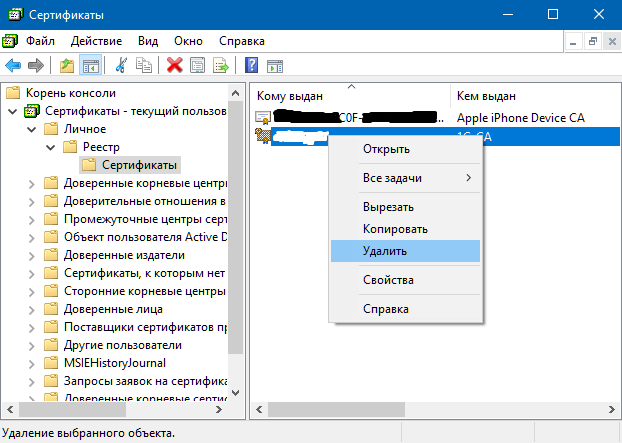 Как удалить установленный личный сертификат в операционной системе Windows 10