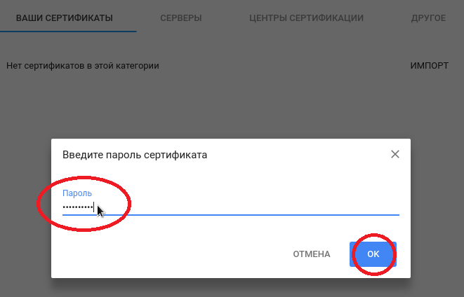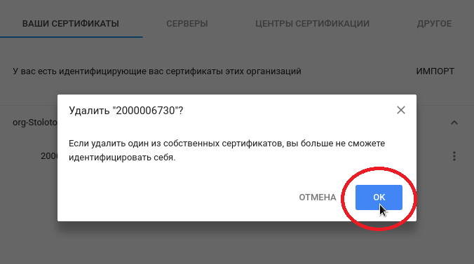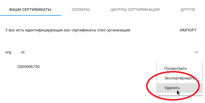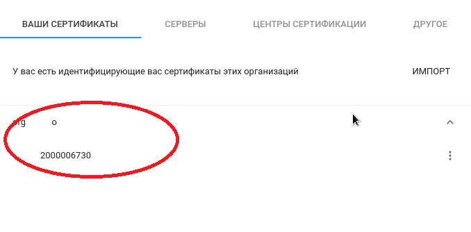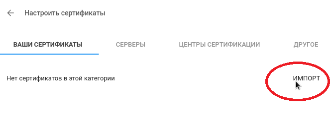 - После очистки от устаревших сертификатов, начинаем добавление. После нажатия кнопки "ИМПОРТ"