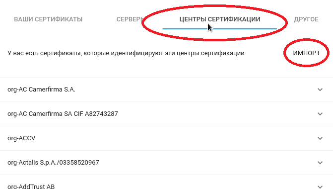 Для добавления "Корневого сертификата" перейдем в раздел "ЦЕНТРЫ СЕРТИФИКАЦИИ" и нажмем кнопку "ИМПОРТ"