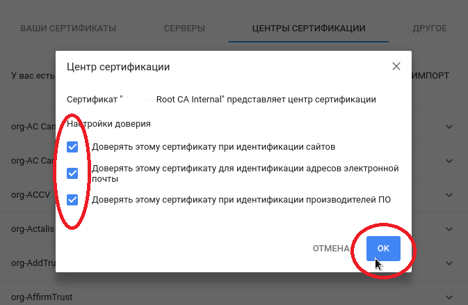 - В некоторых случаях, паример если в контейнере содержится не "полная цепочка сертификатов", а только Ваш личный сертификат, может понадобиться добавить и разрешить корневой сертификат сервера, для предотвращения возникновения у Вас проблем при "Общении" с сервером.