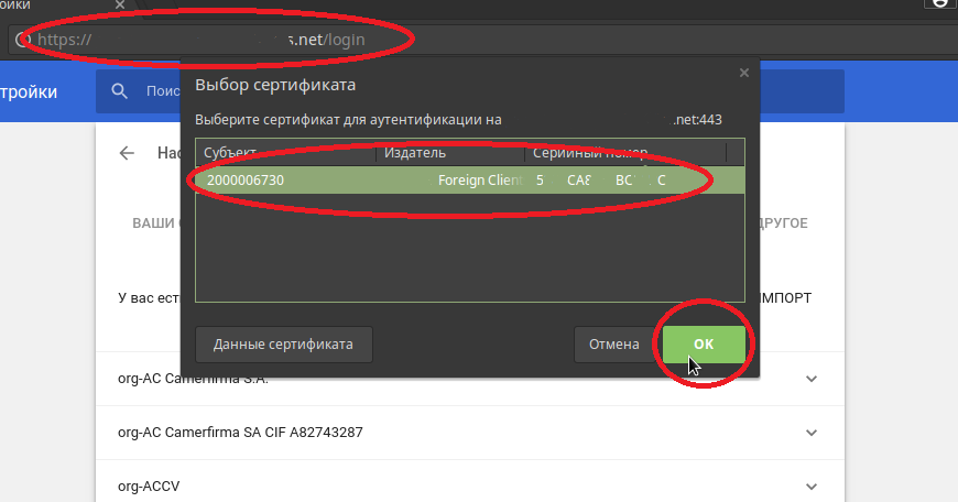 - Если всё сделали правильно и сертификаты были актуальные, то проверяем авторизацию на необходимом сайте, например. При правильной настройке, после перехода на сайт Вы увидите следующего вида окно, выбрав сертификат и нажав кнопку "Ок", Вы попадете на желанный сайт!