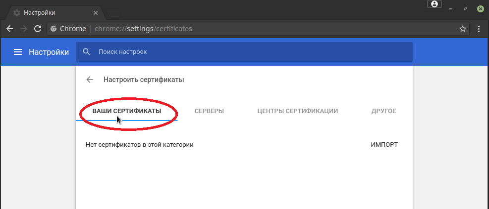 - В открывшихся настройках сертификатов выбираем пункт "ВАШИ СЕРТИФИКАТЫ", если выбрано иное.