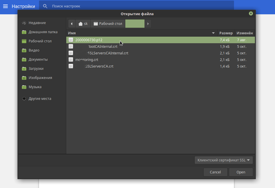 Как и в предидущем случае, выбираем сертификат и нажимаем "Открыть"